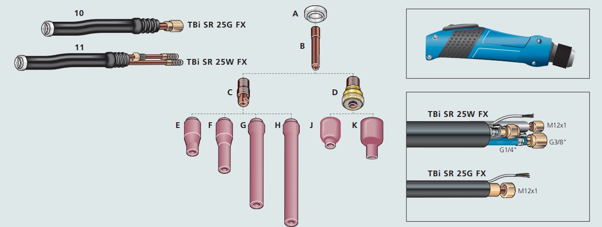 U pitanju je SR 25G (FX) TSB 35/50 gorionik za TIG zavarivanje koji ima zračno (plinsko) hlađenje i fleksibilni vrat.